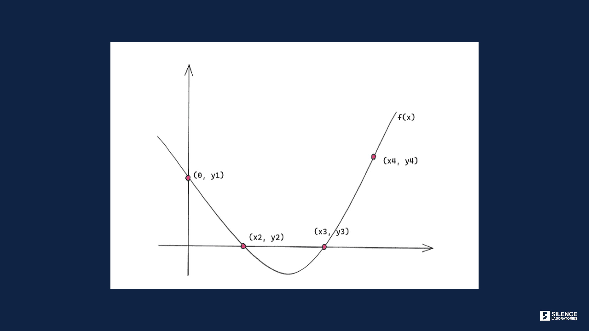 Now he generates solves f(x) for unique x values to get the shares in the form of points on the curve: (x1, y1), (x2, y2), (x3, y3), and (x4, y4). One fine day the user decides to regenerate his private key. He polls any 3 shares, plugs them into a Lagrange interpolation formula, and gets back his original function f(x). The user knows that the constant term of f(x) is the secret.