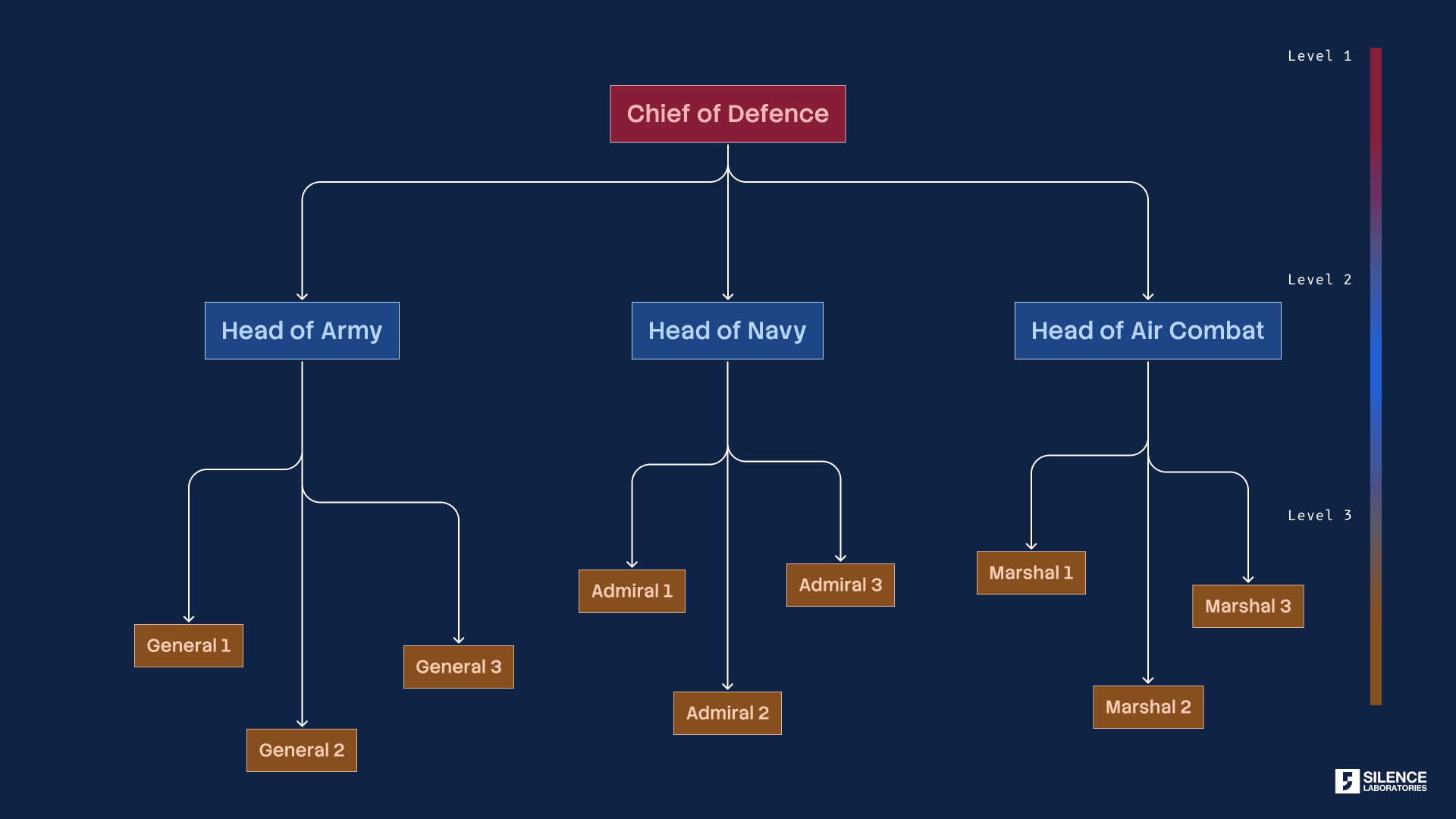 Figure 3 describes the hierarchy in the Defence Organisation with the Chief of Defence having the highest accessibility followed by the Head of Army, Navy, and Air combat. At the lowest level of the hierarchy are the Generals, Admirals, and Marshals of the Army, Navy, and Air combat respectively.