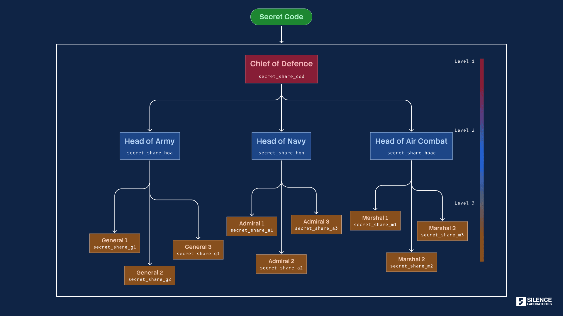 The above example shows how the access structure is defined by utilizing ranks. The trusted authority — the Chief of Defence in the above example has a significant stake in regenerating the secret code. Even if covert communication happens without his participation no group members can collude to access the vault.