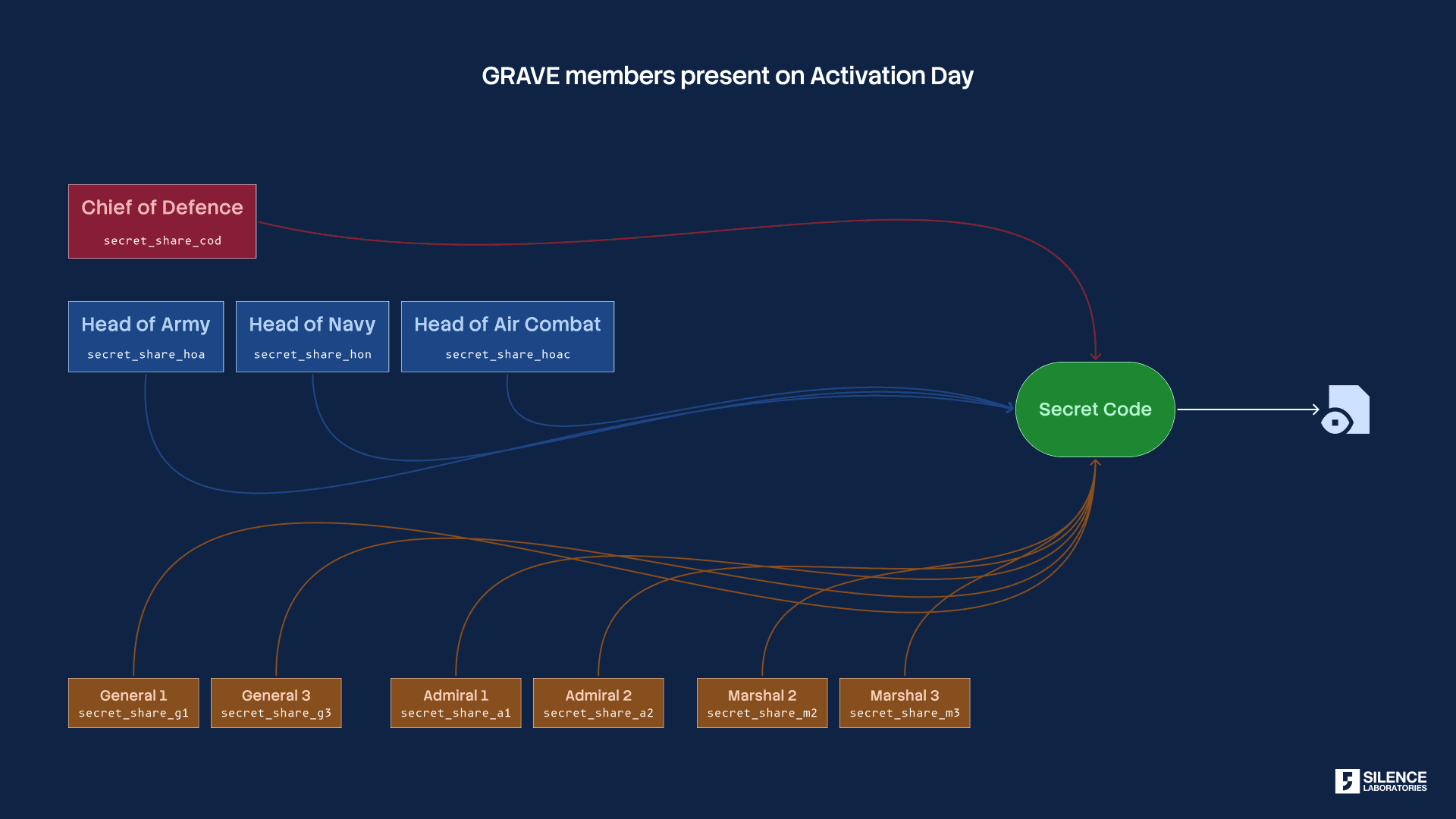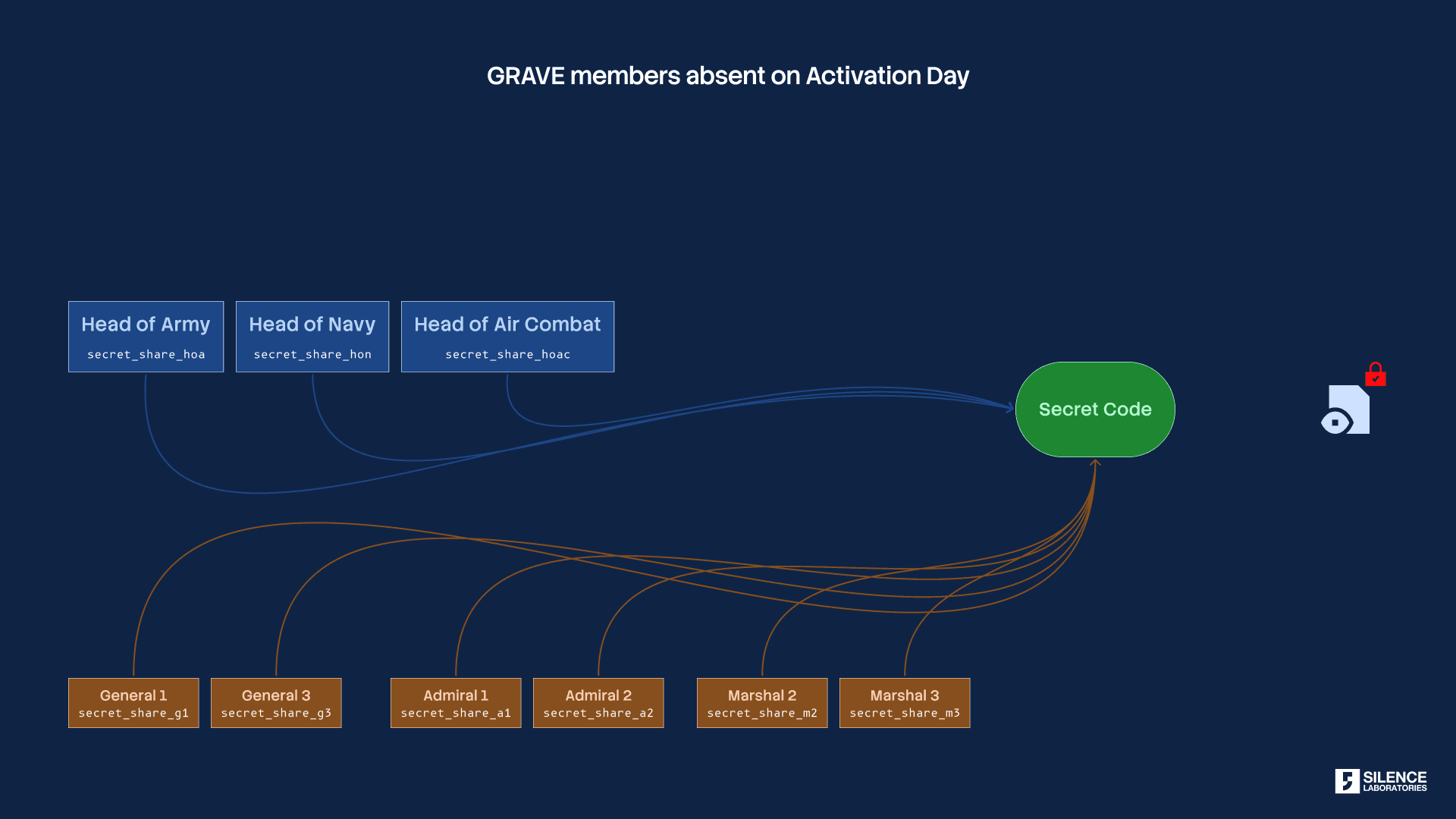 2. During the day of activation of Protocol Grave, at least 10 members can present their shares. The secrets shared are presented on the activation day by 10 members of Grave. Note that at each level the hierarchy is enforced (Refer to Figure 5).