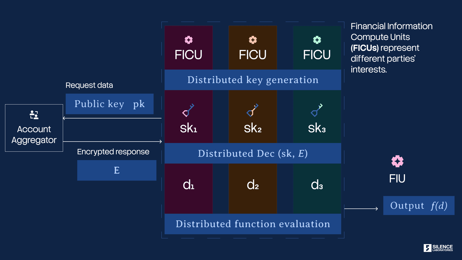 This is precisely the mechanism Silent Compute implements. Rather than delivering an encrypted payload to a single FIU endpoint — which that FIU then decrypts — the Silent Compute architecture distributes the decryption key as cryptographic shares across multiple legally isolated Financial Information Compute Units (FICUs). No single FICU can reconstruct the raw data. Instead, computation is performed across the distributed shares, and the FIU receives only the output of a pre-defined, consent-bound operation: a credit score, a risk assessment, a spending aggregate. The consent artefact is extended with signed opcode sequences that cryptographically specify which computations are permitted — turning use limitation from a compliance aspiration into a mathematical constraint.