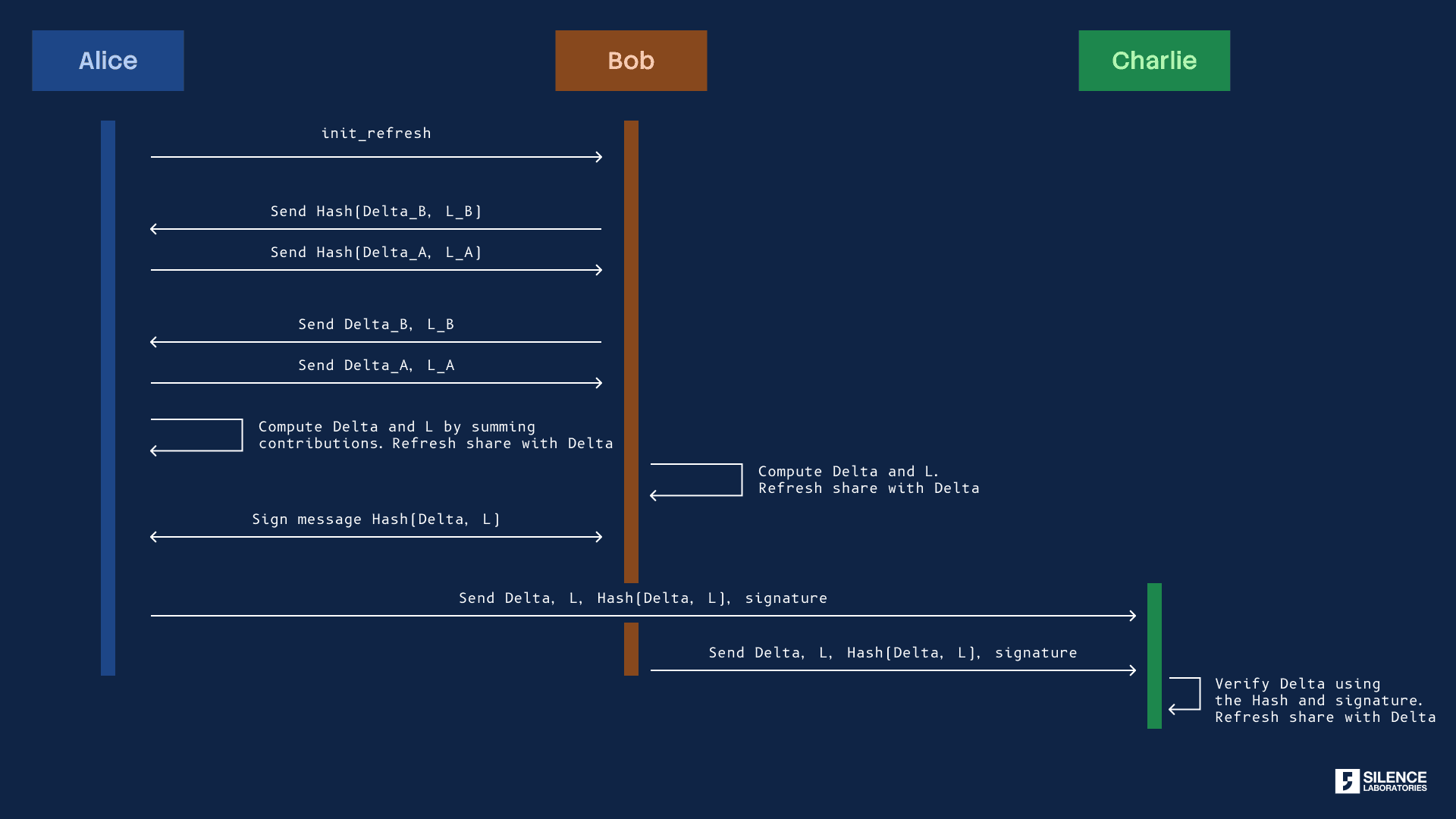 To summarize, all a party needs to know is the value of Δ, and they are able to update their key share entirely on their own, including their points on polynomials to which they don’t know the underlying curve. This is what enables the offline aspect of the refresh.