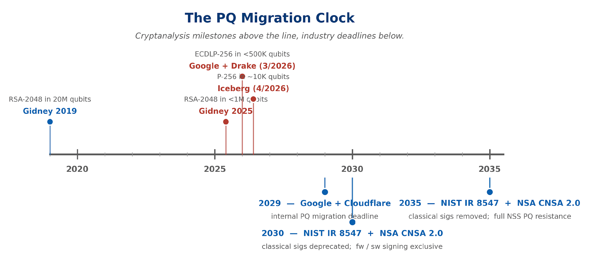 Figure 2. Cryptanalysis milestones (above) and standards-body deadlines (below). The window between them is the deployment window.