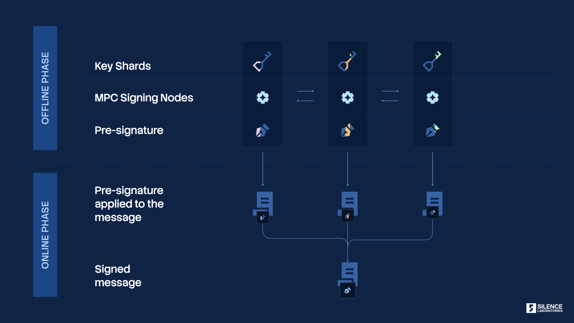 Caution: it is imperative that each pre-signature is used exactly once. Repeating rₓ for two messages in the single party case leads to catastrophic failure by nonce reuse, and the same logic applies in the threshold setting. This is often easier said than done—especially in the context of cloud deployments, protecting against state reuse can be quite tricky. Employing the offline-online paradigm therefore necessitates good engineering and system administration practices to ensure that pre-signature reuse does not happen.